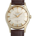 - 自動巻きCal.551を搭載した“コンステレーション”です。文字盤は人気の12角のパイパンダイヤルです。ダイアル上のインデックス、オメガマーク、スターはアップライトです。リューズにはΩマークがあります。ケースはYG、尾錠はSS(ゴールドプレート)です。1959年頃製造。