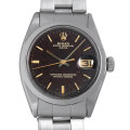 - 金属塊から削りだした防水性の高いオイスターケースと、全回転式ローターを搭載したパーペチュアル機構を搭載した“オイスターパーペチュアル・デイト”です。デイトジャストよりもリーズナブルで、ダイヤルコレクションが豊富に揃い、ケース違いでバリエーションが豊かなため、年代を問わず幅広い層に受け入れられています。ダイアルはブラウンチェンジされた希少なブラックミラーダイアル、ブレスは7205FF57、キャリバーはハックなしの1570です。1965年製造。