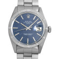 - ロレックス オイスターパーペチュアルデイト Ref.1501です。飛行機のエンジンに似せて作られたといわれるエンジンターンドベゼルが非常に印象的で、6mmの大きめなリューズにクラウンシンボル、ダイアルは現行品にはない独特な色合いのブルーモザイクダイアルなど時代を感じさせるデザインとなっております。