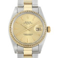 - 金属塊から削りだした防水性の高いオイスターケースと、全回転式ローターを搭載したパーペチュアル機構を持つ“オイスターパーペチュアル デイト”。その中でもこちらは、流通量の少ない大変貴重なモデルです。アップライトインデックスとエンジンターンドベゼルが特徴的。イエローゴールドを使用していることもあり、シンプルですがゴージャスな雰囲気です。ハック機能付きの1570キャリバーを搭載しており、細かく時間を合わせることが可能です。