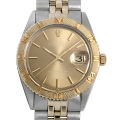 - SSケースにイエローゴールド製の両方向回転ベゼルを備える希少なデイトジャスト サンダーバードRef.1625です。ムーブメントには名機と名高い自動巻Cal.1570(ハック機能つき)を搭載しています。文字盤はブラウンダイヤルです。現行モデルとは異なるアンティークならではのデザインや造り、経年変化による独特の雰囲気を堪能することが出来る逸品です。