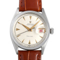 - 1950年代の手巻きムーブメント搭載の“オイスターデイト・プレシジョン”です。ほんのりアイボリーに変色したシルバーダイヤルはくさびインデックスとクラウンロゴが手間のかかる彫り込みで外周のミニッツサークルがいい雰囲気です。時分針はドルフィン針で秒針はブルースチール、カレンダーは赤カレンダーとクラシカルな組み合わせでアンティークロレックスの要素が沢山入った1本です。1953年頃製造。