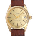- ロレックスのデフュージョンブランドとして知られるチューダー。こちらはロレックスのオイスターケースを使用した“オイスターデイト”です。裏蓋とリューズにはロレックスのクラウンマークがございます。ダイアル12時に当時としては珍しい盾のロゴマークが配されています。ムーブメントには手巻き・Cal.2423を搭載。1969年頃製造。