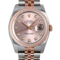 - 1945年にリリースされ、今やロレックスの顔とも言える「デイトジャスト」は、金属塊から削りだした防水性の高いオイスターケース、午前0時頃瞬時に日付けが変わるデイトジャスト機構、全回転式ローターを搭載したパーペチュアル機構と、ロレックス三大機構を搭載したモデルです。ピンクのダイアルに10ポイントのダイヤインデックスを配し、ジュビリーブレスを組み合わせることで、高級感あふれる華やかなデザインに仕上がっています。