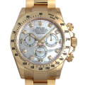 - “キング・オブ・クロノグラフ”の称号に相応しい、圧倒的な人気を誇る“コスモグラフ・デイトナ”。こちらはケースとブレスの素材にK18イエローゴールドを採用し、ホワイト・マザー・オブ・パールのダイアル上に、インデックスとして8個のダイヤモンドをセットしたゴージャスな仕様です。