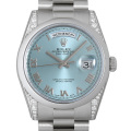 - ロレックスの最上級ラインとして1956年に誕生以来、最高級の素材と質感に拘ったハイクラスシリーズ”デイデイト”。こちらはプラチナモデルにのみ展開されているスペシャルカラーのアイスブルーダイヤルを備えたモデルです。他のゴールド素材とは違いフルーテッドベゼルが存在しないのも特徴です。