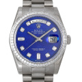 - ロレックスの最上級ラインとして1956年に誕生以来、最高級の素材と質感に拘ったハイクラスシリーズ”デイデイト”。こちらは文字盤に「ラピスラズリ」という深みのある瑠璃色の天然石を使用した、まるで工芸品のような風格あるモデルです。流通量が少ない為、ご覧頂くのは初めてと言う方も多いのではないでしょうか。 ケース、ブレスにはホワイトゴールドを使用しており、腕に着けたときにズシリと感じる重量感は最上級モデルならではの感触です。