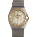 - オメガを代表する最もオーソドックスでドレッシーなデザインの“コンステレーション”。全モデルがクロノメーター認定を受けた高精度コレクションで、ベゼル両側の「グリフ」と呼ばれる爪のデザインが印象的です。シャンパンカラーのマザーオブパール上に12個のダイヤモンドインデックスを配し、素材にスティールとイエロールドを採用した高級感溢れるモデルです。
