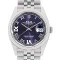 - バーゼルワールド2019で発表された「デイトジャスト36」です。こちらは新色のオーベルジーヌダイアルとなっており、インデックスの9時位置「IX」と6時位置「VI」にダイヤモンドをセッティングした優美で華やかな一本です。 ムーブメントには14件もの特許を取得した自社開発Cal.3235を搭載。クロナジーエスケープメントと呼ばれる新開発の脱進機を備え、パワーリザーブも約70時間まで延長されています。
