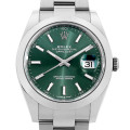 - 長い歴史の中で、多彩なバリエーション展開が行われてきたデイトジャスト。こちらは、新色の爽やかなミントグリーン文字盤の2022年新作モデルです。14件もの特許を取得し、新開発の脱進機クロナジー・エスケープメントを採用した自社開発キャリバー3235を搭載します。パワーリザーブはおよそ70時間。通常のデイトジャストとは異なりケース径が41mmとサイズアップしております。100m防水。