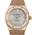 - “ロイヤルオーク”はラグジュアリー・スポーツウォッチとして1972年に発表され、今やオーデマ・ピゲの顔として高い人気を誇る代表作です。こちらはピンクゴールドを採用した格調高いモデルです。エレガンスな印象を醸し出しており、フォーマルな場にも似合います。キャリバー3120を搭載。パワーリザーブ60時間。50m防水。