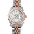 - 1945年にリリースされ、今やロレックスの顔とも言える“デイトジャスト”。こちらのモデルは、素材にステンレススティールと華やかなローズゴールドを使用したコンビモデルです。白文字盤に10ポイントダイヤをセッティングした、清楚なダイアルデザインです。