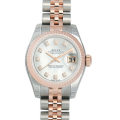 - 1945年にリリースされ、今やロレックスの顔とも言える“デイトジャスト”は、金属塊から削りだした防水性の高いオイスターケース、午前0時頃瞬時に日付けが変わるデイトジャスト機構、全回転式ローターを搭載したパーペチュアル機構と、ロレックスの三大機構を搭載したモデルです。ピンクゴールドとステンレスのコンビモデルで、インデックスにはダイヤモンドをセッティング。柔らかい質感が落ち着いた印象を与えます。世界的にも人気が高く品薄の商品です。