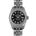 - 1945年に登場し、今やレディースロレックスの顔とも言うべき存在の“デイトジャスト”。金属塊から削り出した防水性の高いオイスターケース、午前0時頃瞬時に日付けが変わるデイトジャスト機構、全回転式ローターを搭載したパーペチュアル機構という、ロレックス三大機構を搭載したモデルです。様々なバリエーションがありますが、こちらは黒文字盤上に10粒のダイヤモンドをセッティングした上品なデザインです。
