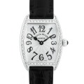 - 流麗なトノーカーベックスケースにダイヤモンドを組み合わせた、ドレッシーな装いにも相応しいモデルです。厳重な素材の選択と厳密な手作業が守られ続けているフランク・ミュラーの工房では、使用するダイヤモンドは常に最高グレードのみを厳選。「トップ・ヴェッセルトン」VVSのダイヤモンドが極上の輝きを生み出しています。ダイアルでは放射状に広がるギョーシェ模様が美麗な光沢を放ち、ブラックのアラビアインデックスと指針が気品ある時を刻みます。