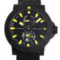 - “マキシ・マリーンダイバー"コレクションより、黒と黄色のカラーリングが印象的な“ブラックシー"を入荷いたしました。ラバーコーティングされたステンレススティールケースは200m防水に対応。逆回転防止ベゼル、12時位置には42時間パワーリザーブインジケーターを備えています。バックスケルトンからETA・2892A2ベースの自動巻きムーブメントUN026をご覧頂けます。