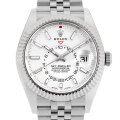 - バーゼルワールド2012で最も話題を集めた、ロレックスの新モデル「スカイドゥエラー」。こちらは2017年発表モデルです。ムーブメントには380のパーツと7つの特許技術からなる新型“Cal.9001”を搭載。文字盤中央で目を引くGMTディスク。GMTマスターとは異なりディスクが回転することで赤い逆三角形のマーカーから第二時間帯(ホームタイム)を読み取ります。また「サロス」と名付けられた年次カレンダー。文字盤外周の小窓で月を表し、3時の小窓で日付を表示。小の月の終わりに31日を飛ばす機構を持っています。リュウズの二段引きを排し、リングコマンドベゼルを搭載。パーツへの負荷を減らし、ローカルタイム/ホームタイム/月・日付の変更を容易にしました。実用性と機能美を兼ね備え、ロレックスの革新性を感じさせるコンプリケーションモデルとなっております。