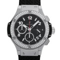- 2005年に新たなウブロの意欲作として発表されてから今日に至るまで、その名の通り世界中で爆発的な人気を続ける“ビッグバン”。こちらはベゼルに114個のダイヤモンドを散りばめた華やかなモデルです。搭載ムーブメントは自動巻きCal.2894-2。クロノ秒針に指し色として使われた赤が力強い印象を与えるモデルです。