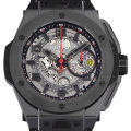 - 2013年のバーゼル・ワールドで発表された「ビッグバン」の新作を入荷いたしました。フェラーリとのコラボレーションモデルで、車のホイールからインスピレーションを受けたローター、文字盤9時位置にはフェラーリ社の「跳ね馬」エンブレム。ベルトステッチにはフェラーリのコーポレートカラーであるレッドが使われるなど、フェラーリファンには堪らないデザインです。1000本限定。ブラックセラミックケースにウニコ(Cal.HUB1241)を搭載。72時間のパワーリザーブに対応しています。