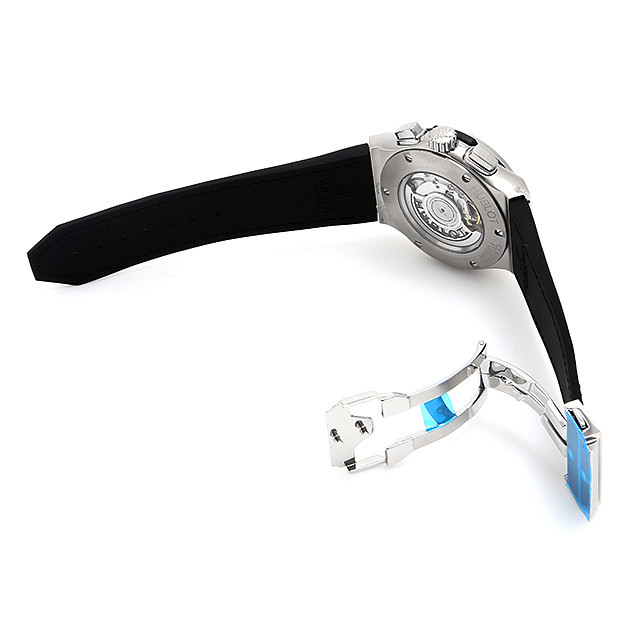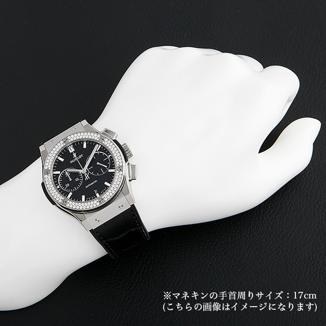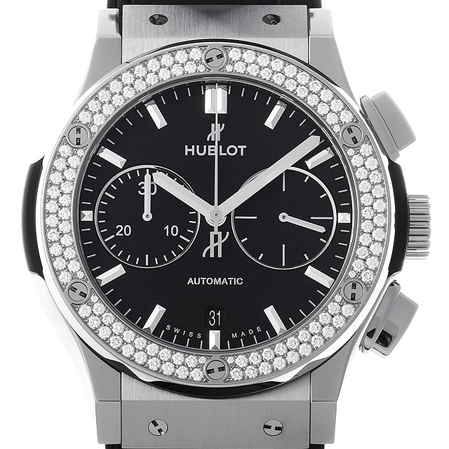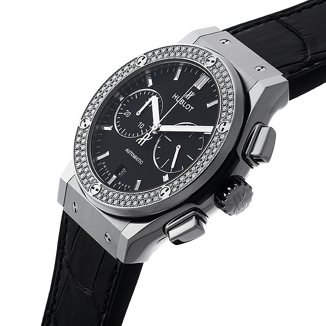 - 人気が高い“クラシック・フュージョン”のクロノグラフモデルです。こちらはベゼルに126個のダイヤモンドをセッティングしたモデルです。ブラックフェイスにシルバーのハンド&インデックスの組み合わせが、視認性が高く落ち着いた雰囲気の2つ目クロノグラフです。バックスケルトンからは、HUB1143自動巻きムーブメントの精巧な動きをじっくりとご堪能いただけます。チタンケースの為軽く装着感も良い時計です。パワーリザーブ42時間。
