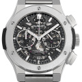 - ウブロが掲げる“フュージョン・コンセプト”と“クラシックシリーズ”が融合して生まれたクラシック フュージョン。こちらは素材にチタンを採用し、ポリッシュ仕上げとサテン仕上げを組み合わせた意匠のモデルです。ブレスタイプですが見た目ほど重さを感じさせないのもチタンの特徴です。ダイアルはスケルトンになっており、裏と表両面から内部機構をご覧いただけます。