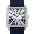 - 直線と曲線が織り成すケースシェイプが存在感抜群のマスタースクエアーシリーズ。こちらはベゼルに2列、ケースラグ、そして尾錠にもダイヤモンドをセッティングしたゴージャスなモデルです。宝飾メーカーの金無垢モデルと比較しても遜色のないデザインではないでしょうか。シルバーギョーシェダイアルとの組み合わせも美しいですね。