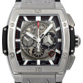 - トノー型ケースが特徴的な“スピリット オブ ビッグバン”。エルプリメロをベースにしたムーブメントHUB4700を搭載したモデルです。ダイヤルとケースバックがシースルーになっているため、その精密な動きをご覧頂けます。ケース径51mm×45mmのビッグケースですが、素材にチタニウムを使用しているので、着けやすい重さになっています。パワーリザーブ約50時間。100m防水。