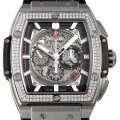 - トノー型ケースが特徴的な“スピリット オブ ビッグバン”。今回入荷したのはケースに2重のダイヤモンドをあしらったゴージャスなモデルです。エル・プリメロをベースにしたムーブメントHUB4700が搭載されており、ダイヤルとケースバックがシースルーになっているため、その精密な動きをご覧頂けます。ケース径51mm×45mmのビッグケースですが、素材にチタニウムを使用しているので着けやすい重さになっています。パワーリザーブ約50時間。100m防水。