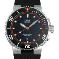 - オリスを代表するダイバーズモデル「アクイス」。こちらは黒文字盤にラバーベルトを組み合わせた43mmモデルです。300m防水を備えた堅牢なケースに自動巻きムーブメントを搭載し、その精緻な意匠をシースルーバックより鑑賞いただけます。針とインデックスに蛍光塗料が施されて視認性が高く、秒針と目盛りのオレンジが手元で格好よく映えてとてもお洒落です。