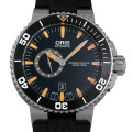 - オリスが提案するダイバーズウォッチ「アクイス」。こちらはオレンジの蛍光塗料が目を惹く、46mmの自動巻きモデルです。ケースサイズが大きく、分厚いモデルのため、腕が太い、がっしりとした体格の方によく似合います。