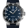 - オリスを代表するダイバーズモデル「アクイス」。こちらは青文字盤にラバーベルトを組み合わせた43mmモデルです。300m防水を備えた堅牢なケースに自動巻きムーブメントを搭載し、その精緻な意匠をシースルーバックより鑑賞いただけます。大ぶりなサイズと海を想起させる深いブルーの文字盤がとてもお洒落です。