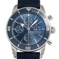 - ブライトリングを代表するダイバーズ・コレクション“スーパーオーシャン”。こちらは2018年発表モデルです。自社ムーブメントを搭載した44mmケースとなり、デイト表記には曜日が追加で採用されています。また、クロノグラフを備え、セラミック製ブルーベゼルとブルーエアロクラシック・ラバーストラップの組み合わせが何ともスポーティーなデザインです。