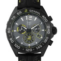 - アイルトン・セナ、そしてタグ・ホイヤーとセナ財団のパートナーシップを讃える、スペシャルエディションの時計です。ステンレススティール製のケースは直径43mm。ブラックゴールドの針にはスーパールミノバがコーティングされています。また、200m防水を備え、実用性にも優れた1本です。随所に施されたアクセントカラーのイエローが非常にエネルギッシュな印象を与えます。