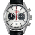- カレラらしいクラシカルなデザインの2カウンタークロノです。クールなシルバーの文字盤にブラックのインダイヤルが配置され、スポーティーなレッドカラーがアクセントとなっています。ムーブメントはCOSC認定クロノメーター「キャリバー17」を搭載。100m防水仕様。ベルトは裏が差し色と同じレッドのパンチングレザーストラップです。