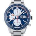 - モーターレースからインスピレーションを受けて誕生した“カレラ”。こちらはブルー&ホワイト、そして差し色としてレッドが印象的に使われた3カウンタークロノグラフで、クラシックな雰囲気の中に新しさを感じさせるダイアルデザインに仕上がっています。ムーブメントは自動巻き“キャリバー16”を搭載。パワーリザーブ42時間、防水性100m。2018年発表モデル。