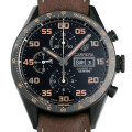 - 日付表示に加え、曜日表示も搭載した“カレラ・クロノグラフ”ブラックPVDコーティングのチタン製ケースにダイアル、セラミック製固定式タキメーターベゼルとブラックで統一しており、ヴィンテージ感溢れるブラウンカーフベルトと相まって男らしい雰囲気を演出してくれるモデルです。