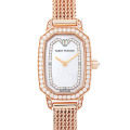 - 大粒で極上の宝石のみを扱うことに拘り続けるジュエラー「ハリー・ウィンストン」。世界的実業家、王侯貴族、セレブリティたちに愛される宝石のエキスパートです。こちらはダイヤモンドカットの一つ「エメラルドカット」のフォルムからインスパイアされたエメラルド・コレクションです。ホワイトシェルダイヤルにダイヤを贅沢にあしらったモデルです。上品なローズゴールドがとても相性のいい一本です。2018年新作
