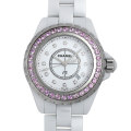- 2000年、シャネル初のスポーツウォッチとして発売された“J12”。こちらはベゼルに40個のピンクサファイア、インデックスに12個のダイヤモンドをあしらった高級感溢れるモデルです。材質には高硬度という特性を持つセラミックを使用しているため、傷が付きにくく取り扱いが楽な時計でもあります。優れたデザイン性の中に、クロノメーター規格ムーブメントを採用するなど、機能とデザインを併せ持った高級ウォッチです。