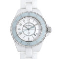 - シャネル渾身の力作であり、2000年の発表から世界中で人気を博している“J12”。従来のホワイトセラミックをベースに、ミントカラーのベゼルを採用しているのが特徴です。バックル部分はバネになっていますので、ネイルをしている爪でも簡単に取り外すことができます。ニットやジャケットからシャネルのホワイトの時計がチラッと見えるととてもお洒落ですね。