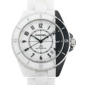 - シャネル渾身の力作であり、2000年の発表から世界中で人気を博している“J12”。こちらは、J12が誕生してから20周年を迎えた記念すべき2020年に発表されました。ココ・シャネルの語録に、「黒はオールマイティ。白も同じ。この2色は、絶対的な美しさの象徴。見事に完璧な調和。」とありますが、その2色を併せた美しく完璧な調和がとれたモデルとなっています。ケースバックはシースルーになり、ムーブメントの動きが楽しめます。シャネル独自の新しい自動巻きムーブメント「キャリバー 12.1」を搭載。50m防水。