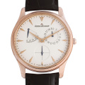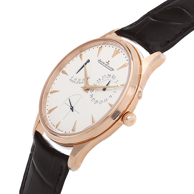- パワーリザーブ表示(リザーブ ド マルシェ)とポインターデイトを搭載したマスターウルトラスリムの入荷です。文字盤に“エッグシェルダイアル”を採用しているのが特徴で、文字通り卵の殻のような質感を持ち、ベージュがかった独特の色合いを魅せています。