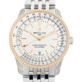 - 1952年の発表以来、航空時計のシンボルとして輝きつづける“ナビタイマー”。2018年ブライトリングの新体制と共に、ナビタイマーはその特徴であるクロノグラフを搭載しないシンプルな3針デザインの時計として登場し、業界に驚きを与えました。しかしながら、視認性の高いインデックスや針、信頼性の高い精度など、変化を取り入れつつもこれまでのナビタイマーの魅力がしっかりと踏襲されています。こちらは、ステンレススチール製ケースに贅沢な18Kレッドゴールド製両方向回転式ベゼルを装備したバイカラーモデルです。パワーリザーブ約38時間。3気圧防水。