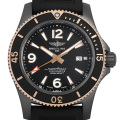 - ブライトリングを代表するダイバーズ・コレクション、”スーパーオーシャン オートマチック 46”。46mmの迫力あるサイズ感のスーパーオーシャンは、ケース素材にブラックスチールを採用し、ベゼルには18金レッドゴールドを使用しております。ラチェット式逆回転防止ベゼルとなっており、さらにプロフェッショナルダイバーウォッチとして2000mもの防水性能を確保しています。