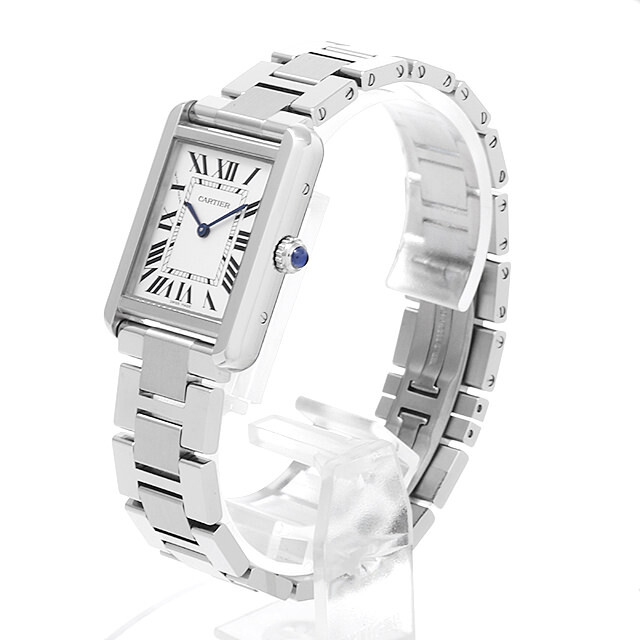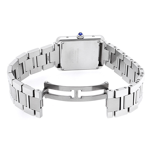 - フラットなスクエアケースにシルバーダイヤルを納めた、タンクシリーズの中でもすっきりとした印象を与えるモデルです。インデックス10時の一部にブランド名を使用しており、細部にまでこだわりが感じられる逸品です。カルティエらしいクール&エレガントなデザインは、コーディネートのポイントとして永く愛用できるので、贈り物にもお勧めです。