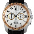 - 2010年に発表された“カリブル ドゥ カルティエ”。カルティエ初の完全自社製自動巻きムーブメントを搭載していたことで注目を集めました。こちらは、ベゼルにピンクゴールドを使用したコンビモデルです。自動巻き1904MCを搭載した2つ目クロノグラフで、6時位置には前後合わせて三日間を表示するワイドカレンダーを備えています。リューズにはブルースピネルがセッティングされています。100m防水。