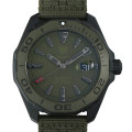 - 2017年 タグ・ホイヤー新作「アクアレーサー キャリバー5」を入荷しました。軽量なチタン製ケースとカーキのダイアルがトレンドのミリタリーテイストにマッチ。ベルトには文字盤と同じくカーキのNATOストラップが採用されています。骨太になりがちなミリタリー調のデザインには珍しく薄型設計になっているため、様々なシーンで活躍できる1本です。300m防水。