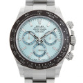 - ロレックスはもとより腕時計を代表する傑作“コスモグラフ・デイトナ”。こちらはケースとブレスレットの素材にプラチナを採用。インデックスにバゲットカットされたダイヤモンドをセッティングした、2014年の新作です。チェスナットブラウンのセラミックベゼルと、アイスブルーダイアルがクールな組み合わせです。