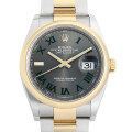 - クラシックウォッチの規範とも言えるロレックス デイトジャスト。こちらはオイスタースチールと18金イエローゴールドを採用したラグジュアリーなモデルです。ロレックスが独自に開発・製造した自動巻き機械式ムーブメントCal.3235を搭載しています。こちらは、2021年新作のスレートの文字盤にグリーンのローマインデックスを配置した、高級感溢れるデザインとなっております。パワーリザーブ約70時間。