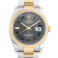 - 2021年に発表された「デイトジャスト36」です。フルーテッドベゼルが採用されており、スレートの文字盤にグリーンのローマインデックスを配置した、華やかで高級感溢れるデザインとなっております。ケース径は36mmとやや小ぶりで使用感の良いモデルです。ロレックスが独自に開発・製造した自動巻き機械式ムーブメントCal.3235を搭載。パワーリザーブ70時間。100m防水。