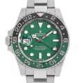 - 2025年発表の"GMTマスターII"です。ダイアルには、ロレックス初となる「セラクロムダイアル」が用いられており、その色味はベゼル下半分のグリーンと揃えられ、統一感が美しい仕上がりです。時・分・秒針に加え、24時間でダイアルを一周する矢印型の24時間針と、両方向回転式の24時間目盛り入りベゼルを搭載。さらに特筆すべき点は、本モデルはリューズがケース左側に配置されているということです。合わせて日付表示窓とサイクロップレンズも9時位置に設けられています。ケース・ブレスレットにはホワイトゴールドを採用しており、ずっしりとした高級感と存在感を味わうことができます。